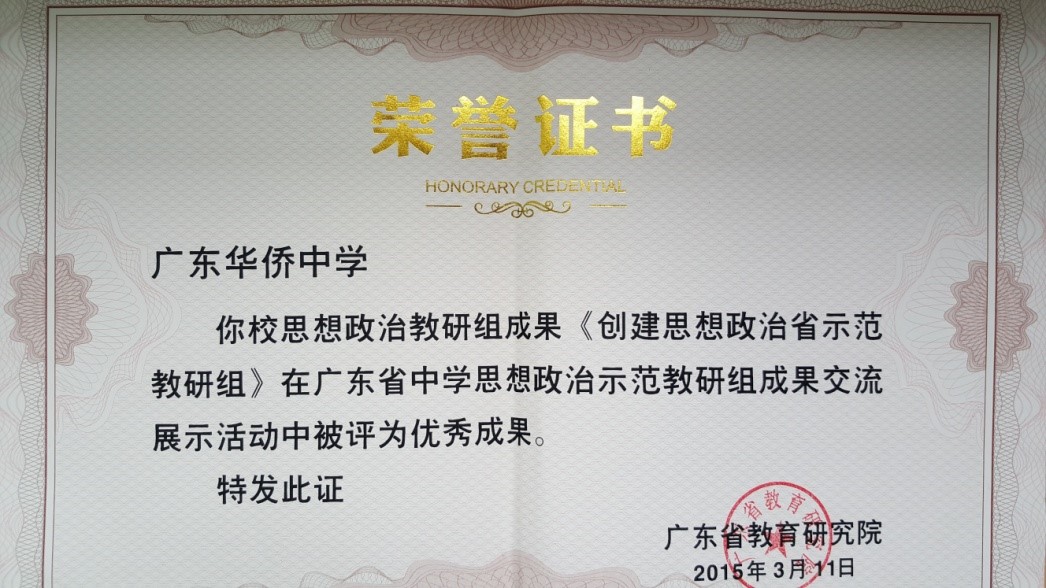 政治科组获得“广东省中学思想政治示范教研组”的光荣称号 来源: 发布时间:2015-10-22 10:40:23 浏览次数: 次 【字体:小 大】 继2013年5月获得“广州市优秀科组”荣誉称号后,科组全体成员戒骄戒躁,同心协力,勇创佳绩,教研组成果获得广东省2015年《创建思想政治省示范教研组》优秀成果奖。同期获得该称号的还有2中、6中、7中、天河中学、玉岩中学、洛溪新城中学。 荣誉来之不易!政治科组全体成员定当奋斗不息,争取在教学教研等各个领域不断提升自我,为进一步提升科组影响力和为侨中跨越性发展贡献出自己的一份力量! 分享到: 【打印正文】